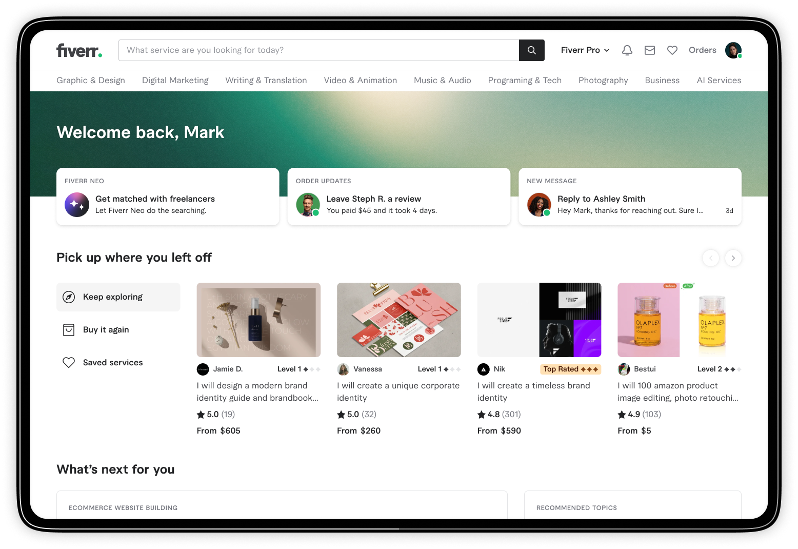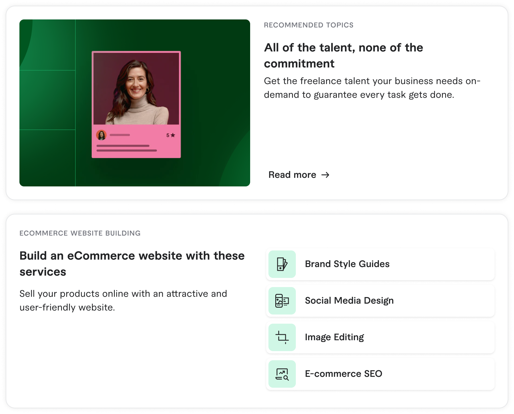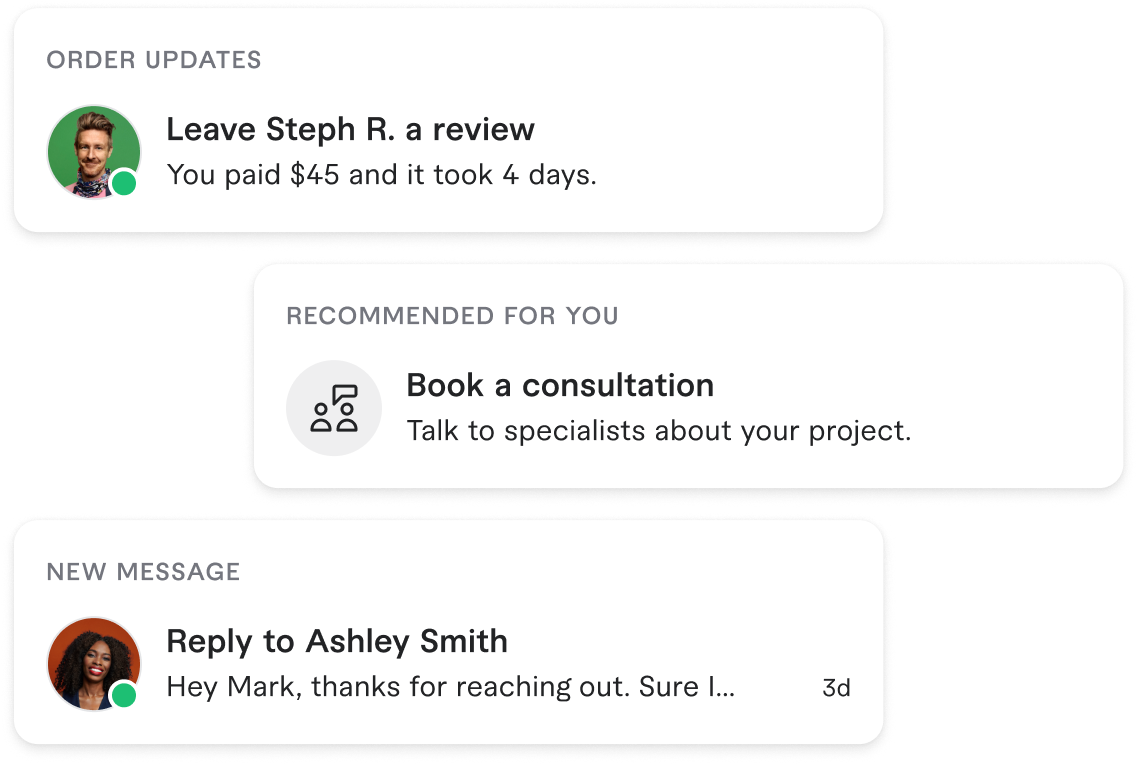A dynamic card at the top of the page that surfaces the buyer's most relevant task — always personal, always actionable. This could be an unread message from a freelancer, a pending delivery review, a prompt to download the app after a first purchase for faster order updates, or an entry point tailored to small and mid-size business owners looking to scale their hiring.